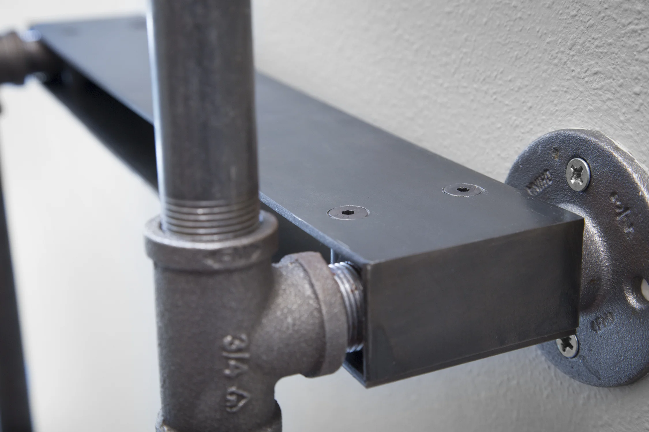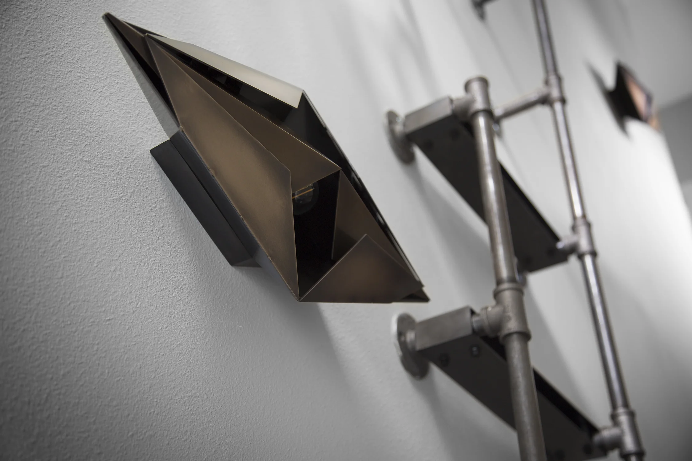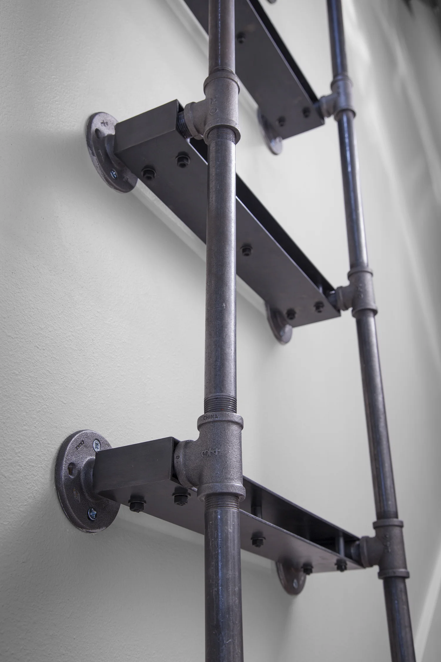 These steel ladder steps are a unique solution to an existing armature that the client had previously mounted to the wall to create a ladder. The challenge was to design something that mechanically fastened to the existing parts, but at the same time is also seamless and stable. The ladder shares a wall with two of the Floating Sconces.